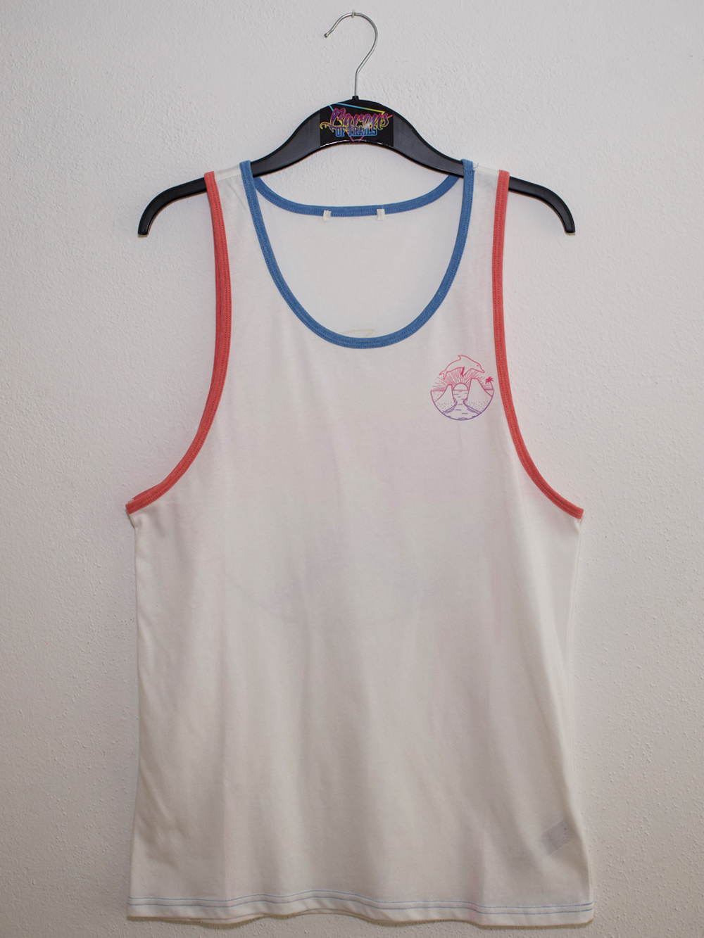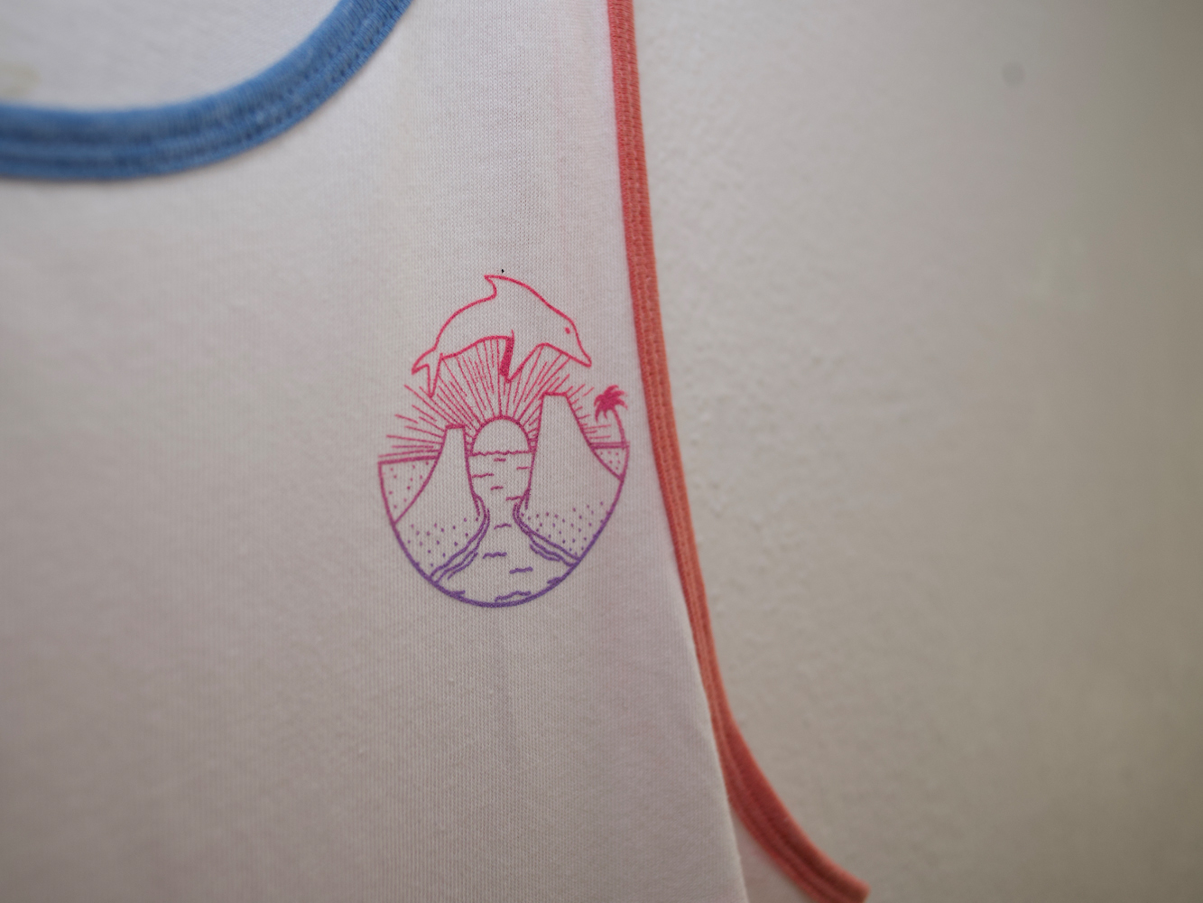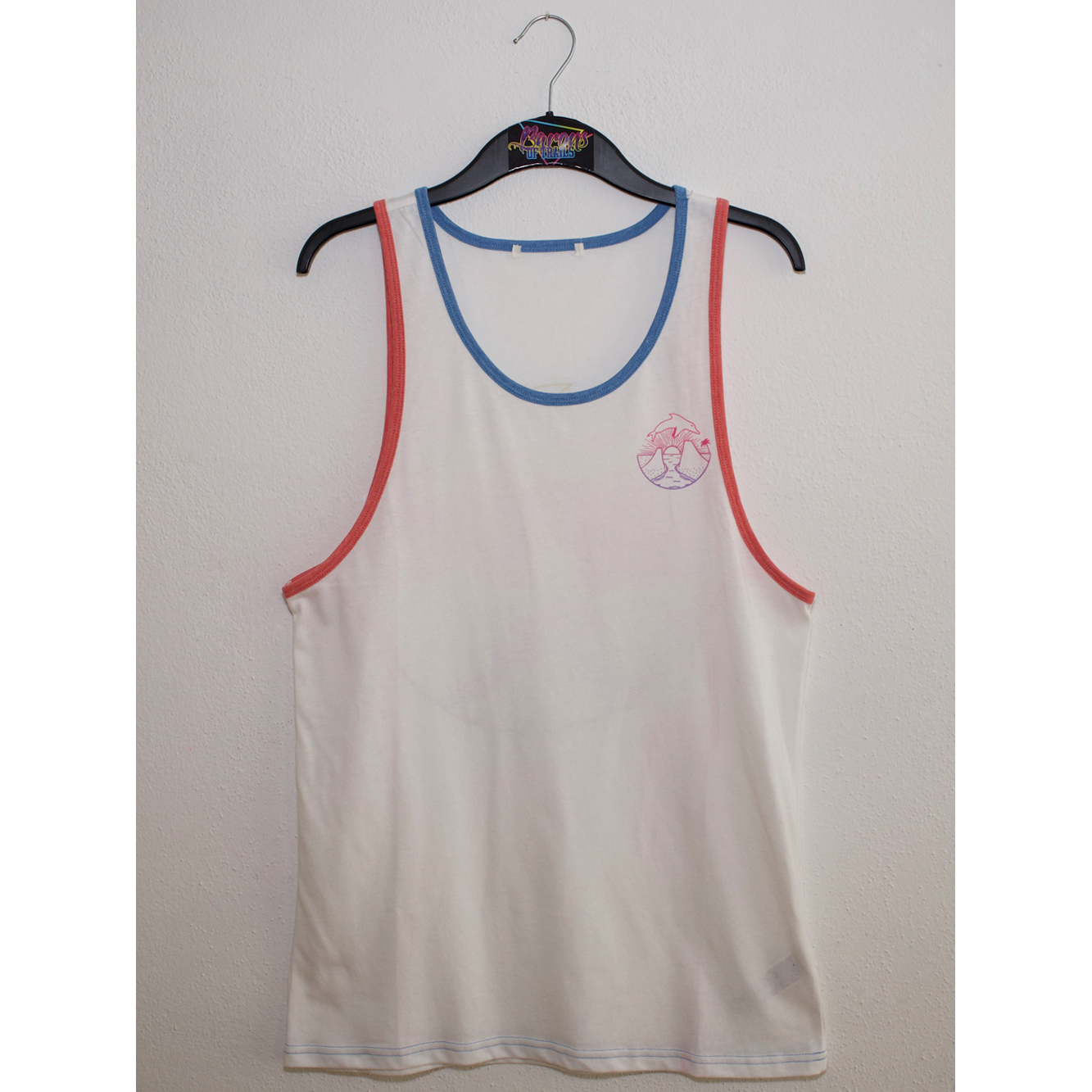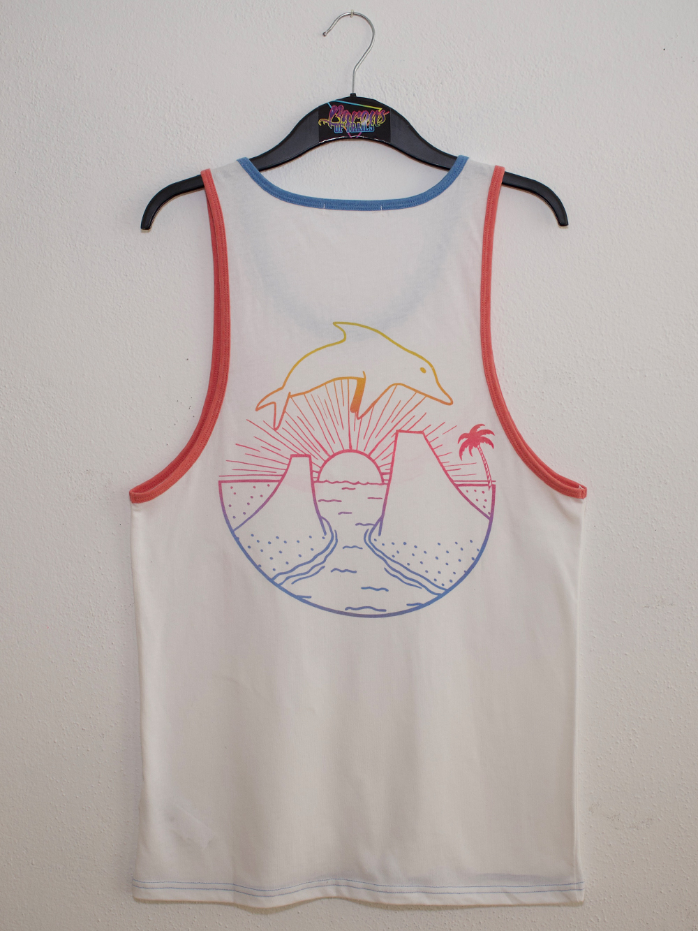 Weisses Tanktop mit buntem Delfin Brust und Rückendruck.