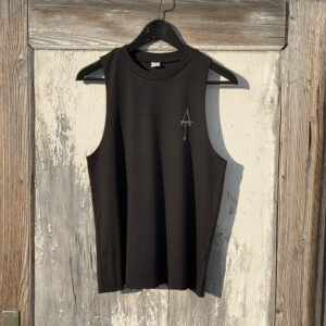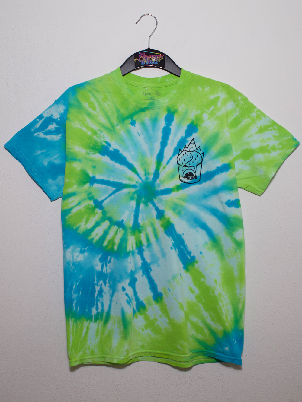 Blau grün gebatiktes Shirt mit schwarzem Brustdruck.