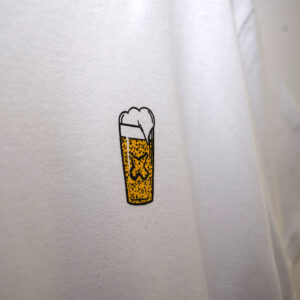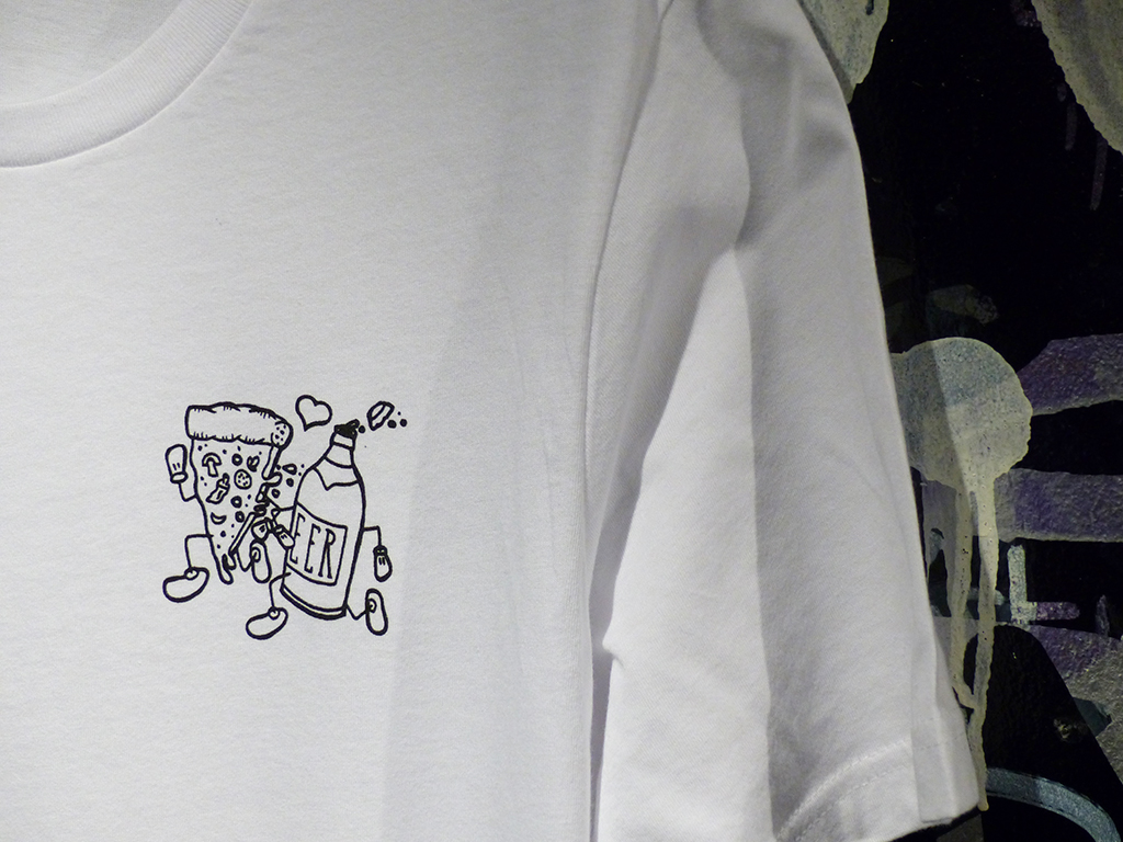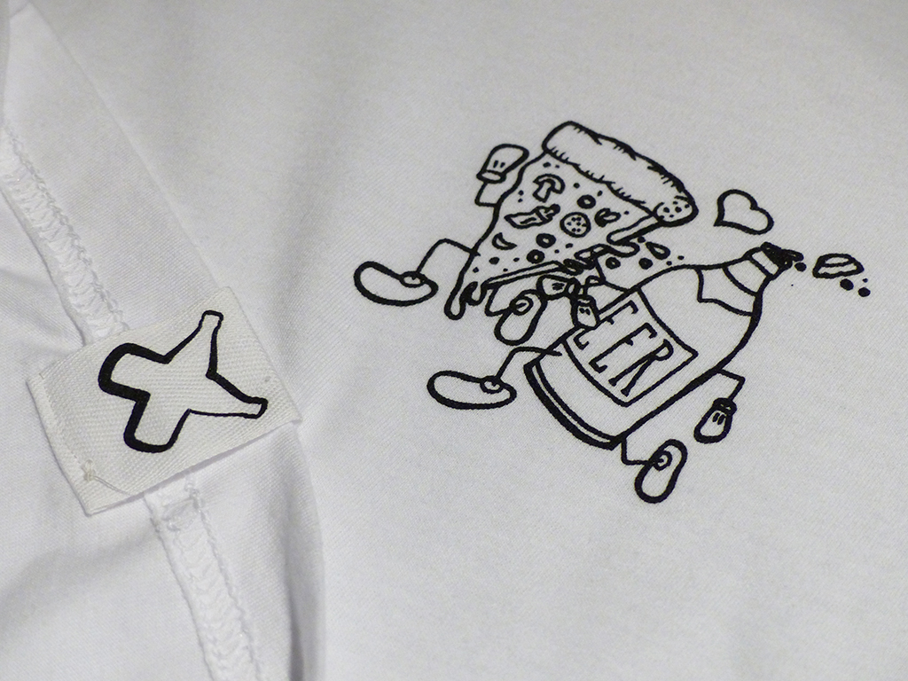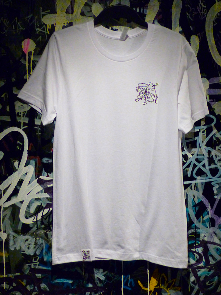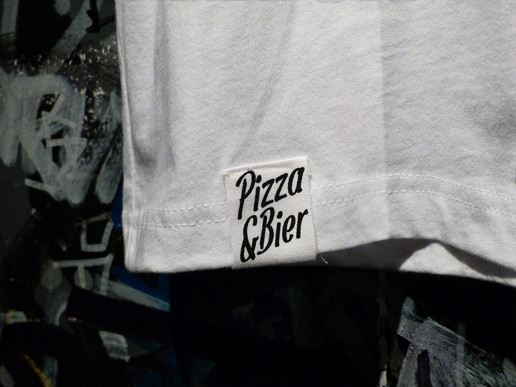 Weißes Shirt mit schwarzem Druck und Label am Bund.